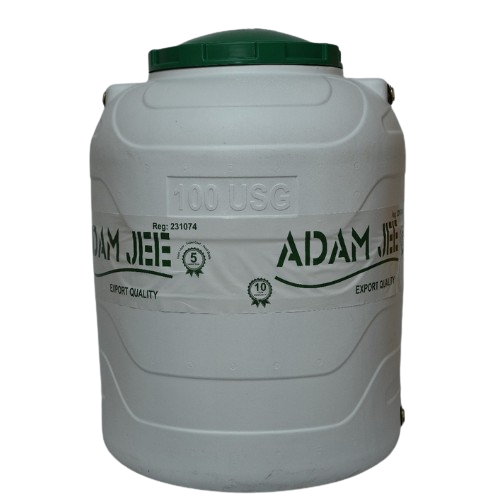 This appears to be a 100-gallon plastic water storage tank or food-grade container manufactured by Adam Jee, designed for export quality use, possibly for water, beverages, or other liquid storage.
